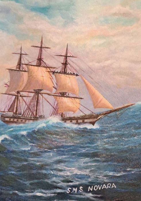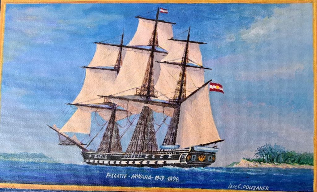 Objavljujemo dvije nove slike (akrilik na platnu) pulskog marinista Cvetka Išića (člana Društva „Viribus unitis“) koje prikazuju brod c. kr. Mornarice „Novara“. Fregata “Novara” građena je je u Veneciji od 1843. do 1850. Bio je to drveni jedrenjak duljine 49,5 metara, širine 14,2 metra. Najpoznatija je po oplovljavanju svijeta pod jedrima od 1857. do 1859. godine. Ova prva velik pomorska znanstveno-istraživačka ekspedicija Austrijskoga Carstva trajala je dvije godine i 3 mjeseca – brod je proveo 551 dana na moru i 298 dana na sidru. Opremljen je za putovanje u pulskome Arsenalu.