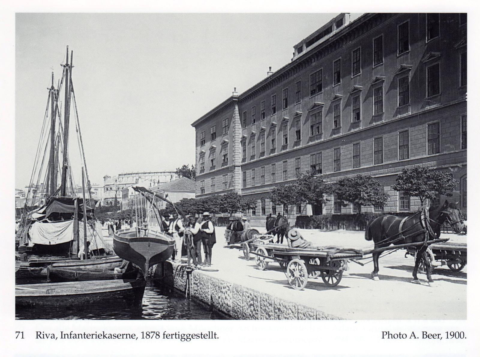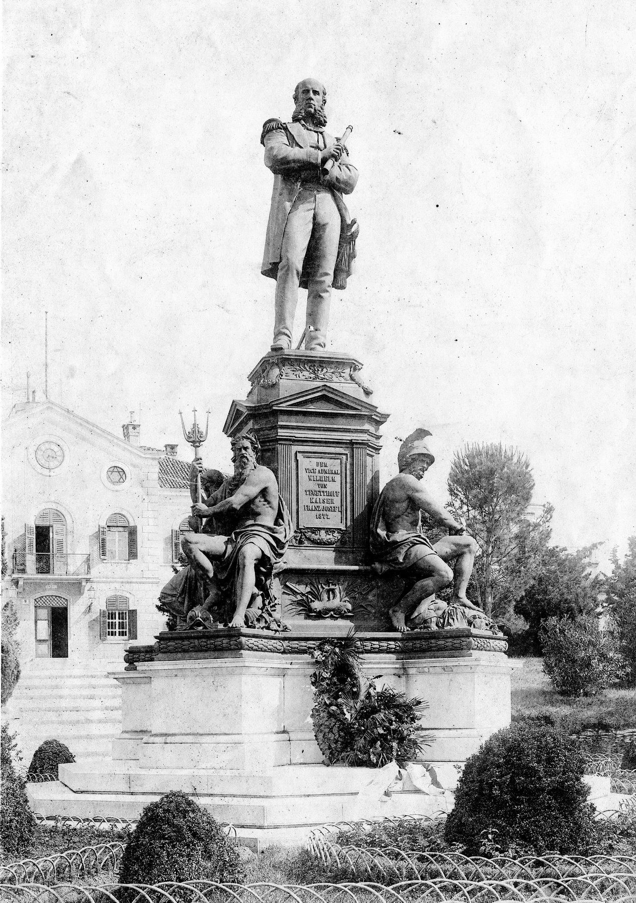 Sjeverozapadno odavde prema Arsenalu bila je Mornarička vojarna (4)(sl. 17) u kojoj su (prije desetak godina) bili smješteni brodogradilišni službenici (a prije deset godina i Glazbena škola – op. B.D.). U pravcu jugozapada na vojarnu se nadovezuje perivoj s prekrasnim egzotičkim stablima i biljkama, nekadašnji Mornarički park (12) u čijem se središtu nalazio spomenik nadvojvodi Maksimilijanu (sl. 18), podignut 1876., a 1919. prenesen u Veneciju i tamo postavljen kao talijanski ratni plijen. Oko parka 1863. je tršćanski graditelj A. Hauser sagradio stambene zgrade za pripadnike c. i kr. Mornarice, koje postoje još i danas. Pored parka, Negrijeva ulica blagim usponom vodi do Mornaričke bolnice (sl. 19)(2), koja je 1863. bila predana svojoj namjeni. Bila je podijeljena u 5 odjela i raspolagala je s 500 postelja, a imala je ljekarnu otvorenu za javnost, parnu kupelj i kade.
