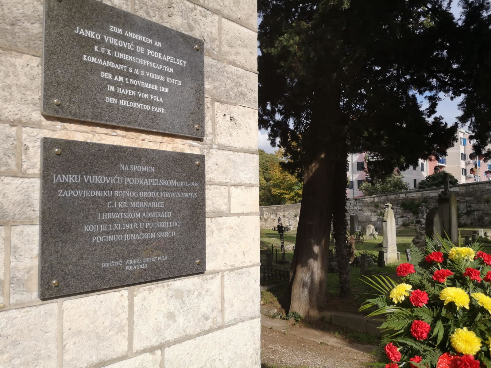 Oko 500 m jugozapadno od Mornaričke crkve nalazi se c. i kr. Mornaričko groblje (sl. 21). Jedinstveno i lijepo, nalik velikom perivoju, okićeno mnogobrojnim čempresima, ono obuhvaća više od 22.000 m2. Najprije je 1862. Ministarstvo mornarice kupilo 4.000 m2 za uređenje Mornaričkog groblja, a 2. listopada iste godine ono je blagoslovljeno. Prva pokapanja bila su u skupnim grobnicama za 30-35 leševa. Zbog nepovoljnog higijenskog stanja 1870. godine je odobreno pojedinačno pokapanje. Narednim kupnjama zemljišta nastala je današnja veličina groblja, na kojemu su i za vrijeme Prvog svjetskoga rata mnogi našli posljednje počivalište pod pulskim čempresima, počevši od žrtava brodske nesreće Lloydova parobroda “Baron Gautsch”, potom onih koji su potonuli s bojnim brodom “Szent Istvan” te s posljednjim žrtvama Prvog svjetskoga rata, koje su stradale pri potapanju zastavnog broda flote “Viribus Unitis”. Ovaj brod je sa svojim zapovjednikom, kapetanom bojnog broda Jankom Vukovićem pl. Podkapelskim (sl. 22), potonuo 1. studenog 1918. u pulskoj luci. Na Vukovićevu smrt podsjeća spomen-ploča na zidu kapelice na groblju (sl. 23). Ovi događaji, kao i teška epidemija gripe posljednje ratne zime, stvorili su potrebu gradnje masovnih grobnica i onemogućili su daljnja pokapanja. U svibnju 1918. bila je planirana gradnja drugog mornaričkog groblja, no do toga više nije došlo.