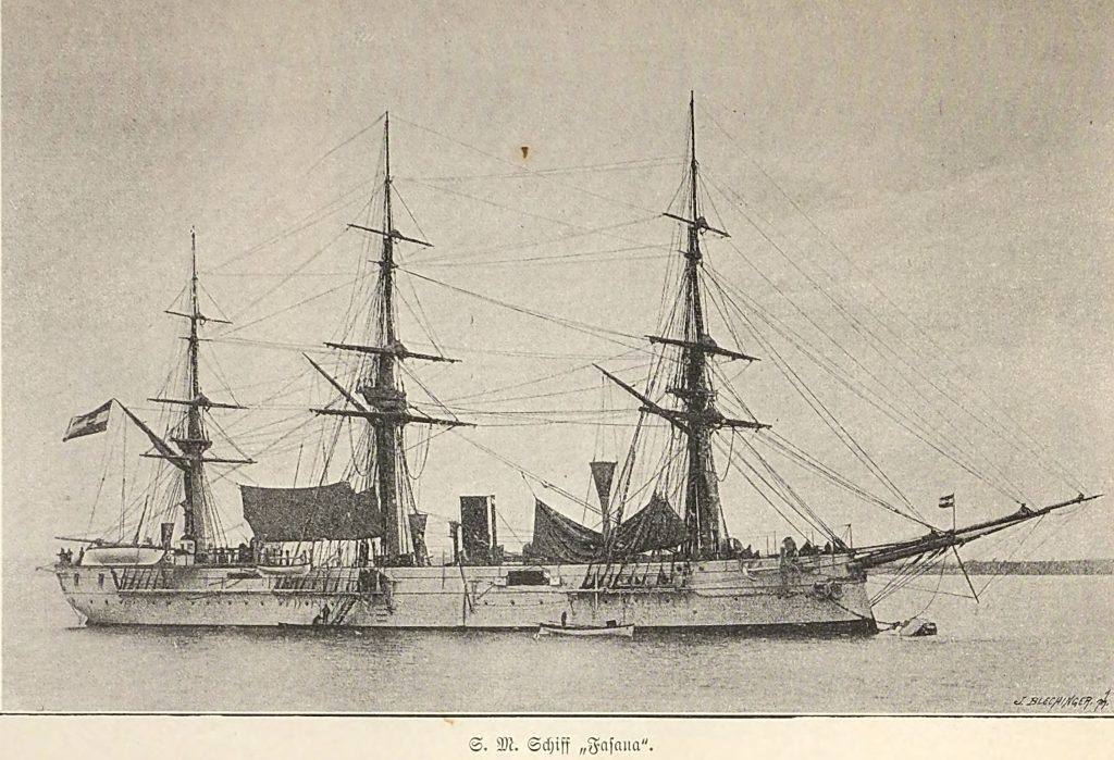 Korveta Fasana (Fažana), pod zapovjedništvom zapovjednika kap. b.b. Emila Edlera von Wohlgemutha, isplovila je 1. rujna 1887. iz Pule na školsko krstarenje u Istočnu Indiju i Istočnu Aziju s pomorskim kadetima koji su 1887. godine završili školovanje na Mornaričkoj akademiji. prema. Ruta (tok putovanja): iz Pule za Bombay, Colombo, Madras, Rangoon, Penang, Singapur, Batavija, Hong Kong, Yokohama, Kobe, Nagasaki, Amoy, Hong Kong, Manila, Saigon i Singapur. 2. veljače 1889. Fasana se vratila u Pulu. Fotografija broda i mornara objavljena je u knjizi u kojoj je opisano to prekooceansko putovanje (objavljena je 1891. u Beču; digitalizirana inačica dostupna je na mrežnim stranicama Austrijske nacionalne knjižnice)