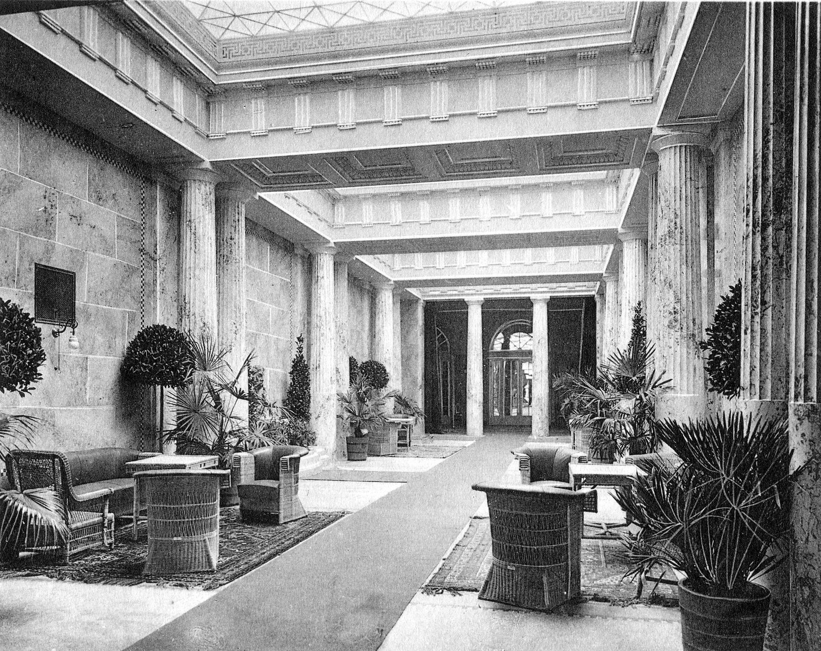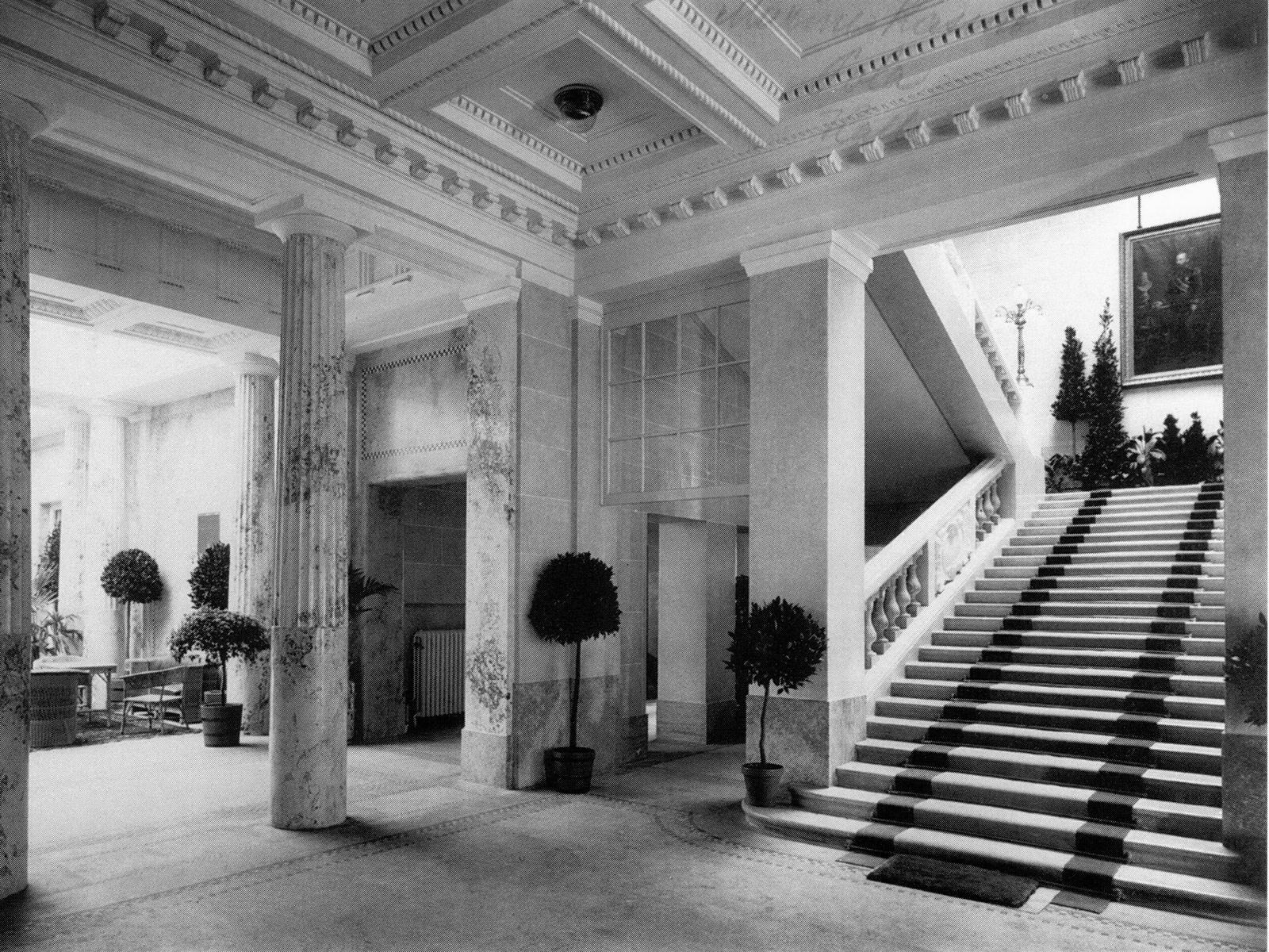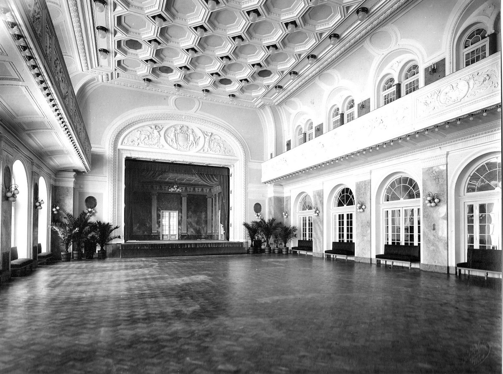 U prizemlju zgrade, ravno od ulaza je predvorje (nekadašnji zimski vrt ukrašen cvijećem) s malom fontanom i kaneliranim stupovima dorskoga tipa. Predvorje vodi do “dvorane ogledala” i velike dvorane u kojoj se i danas, kao nekada, održavaju koncerti, a ponekad i plesne zabave. Iza ulaza i portirnice, u desnom krilu zgrade (gledajući od glavnog ulaza) u manjoj prostoriji bili su kavanski salon, velika dvorana kavane i bar. Ljeti je bila otvorena još jedna kavana na prostranoj terasi na drugom katu, a na istočnoj strani zgrade, nasuprot kazališta, vrtna terasa. Uokolo zgrade bio je zasađen perivoj pun rijetkih južnih biljaka koje su časnici donosili sa svojih putovanja širom svijeta. Pojedina stabla i danas su sačuvana.