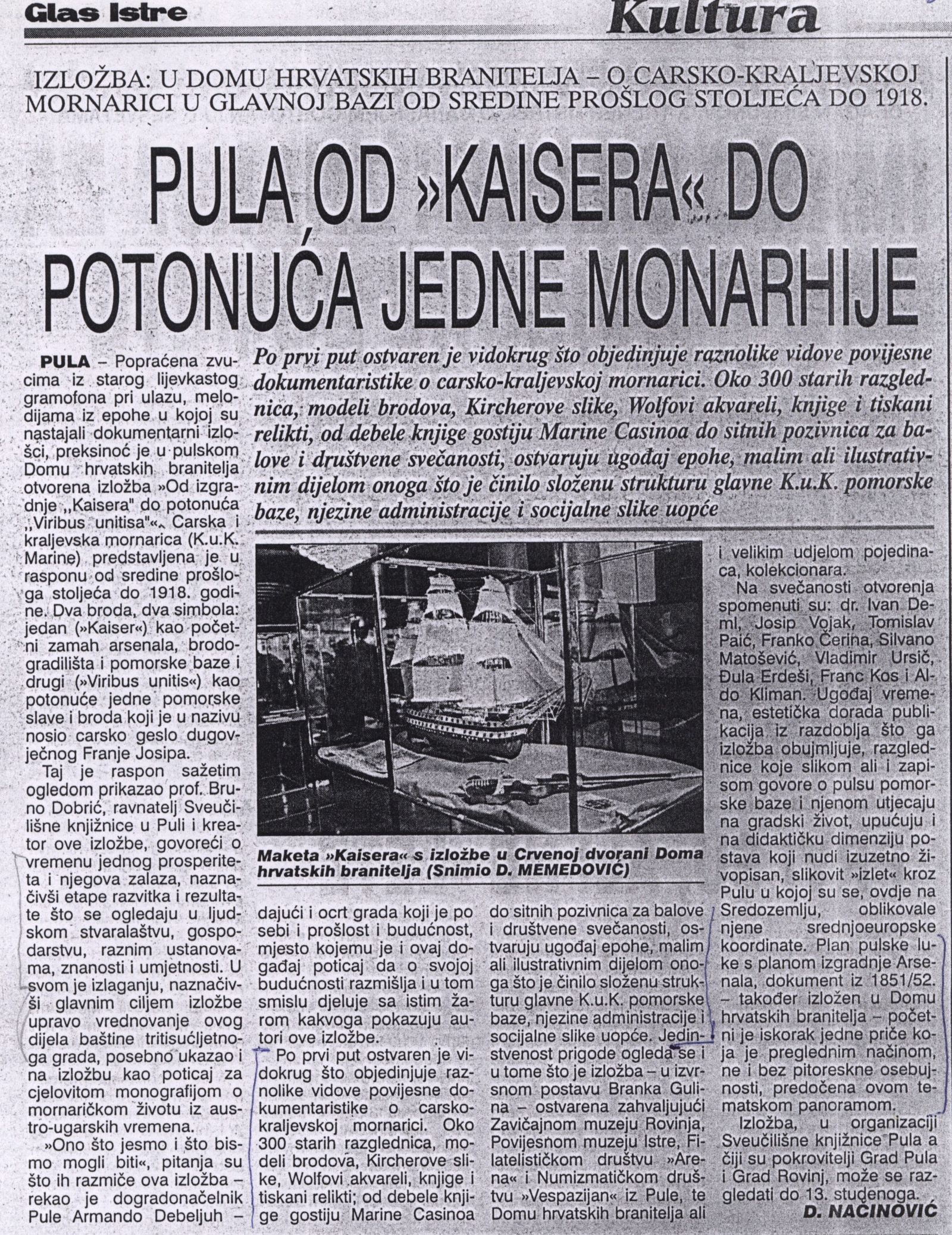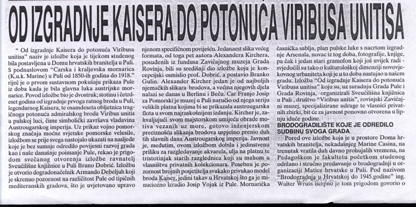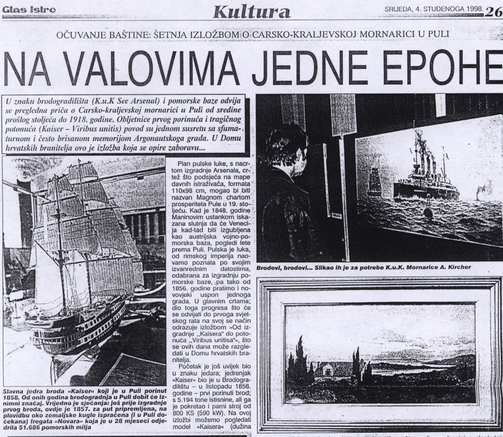 U prilogu: Plakat izložbe “Od izgradnje Kaisera do potonuća Viribus Unitisa” – 29. 10. 1998. – 13. 11. 1998. godine, pozivnica za izložbu i izvješćivanje pulskih novina (La Voce del Popolo, Glas Istre, Pula 3000 Pola).