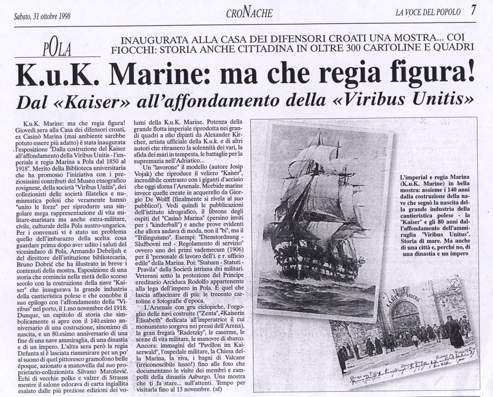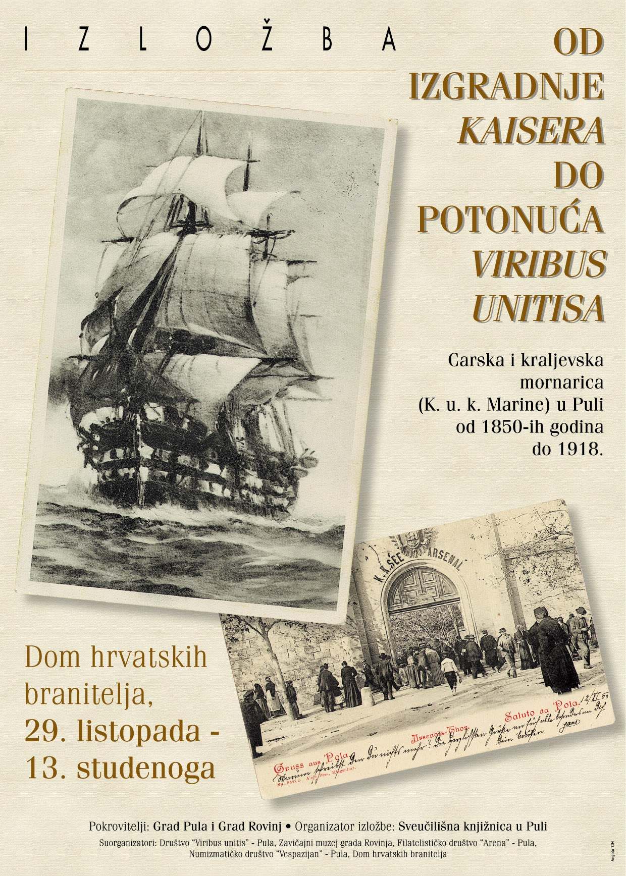 Izložba “Od izgradnje Kaisera do potonuća Viribus Unitisa. Carska i kraljevska mornarica u Puli od 1850-ih godina do 1918.” (29. 10. 1998. – 13. 11. 1998.) koju su organizirali Sveučilišna knjižnica u Puli i pulsko Društvo za proučavanje prošlosti c. i kr. Mornarice „Viribus unitis“, uz sudjelovanje Zavičajnog muzeja Grada Rovinja, Filatelističkog društva „Arena“ Pula i Numizmatičkog društva „Vespazijan“ bila je prva izložba o c. i kr. Mornarici u Puli nakon njezina prestanka postojanja 1918. godine.