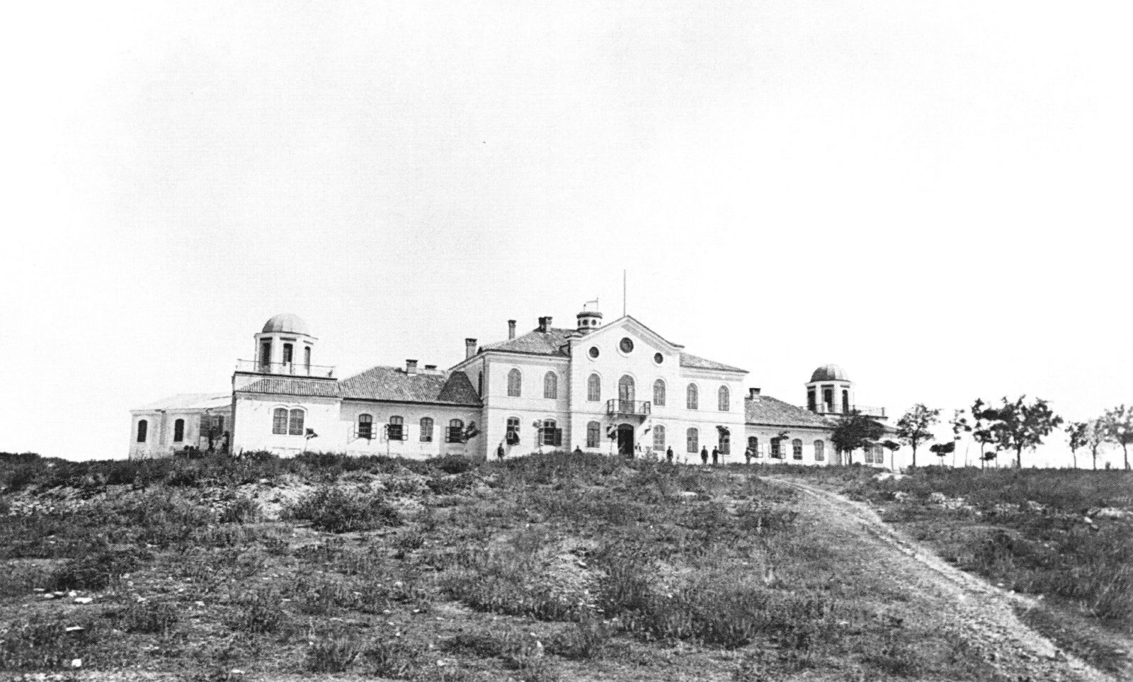 Zgrada, čije je 65 m dugo pročelje gledalo u smjeru sjeverozapada, sastojala se od višekatnog srednjeg trakta i dva prizemna krila sagrađena iza pročelja, svako opskrbljeno jednim tornjem s rotirajućom kupolom. Tornjevi su bili povišeni od tla, podržani masivnim stupovima, a služili su kao zvjezdarnice. Na oba tornja bila je pod kutom od 45° priključena po jedna dogradnja u kojoj su bile smještene sprave za astronomsko određivanje vremena. U prizemlju je cijelu zgradu po dužini presijecao jedan hodnik, a ispod razine zemlje bile su uređene tri podrumske prostorije.