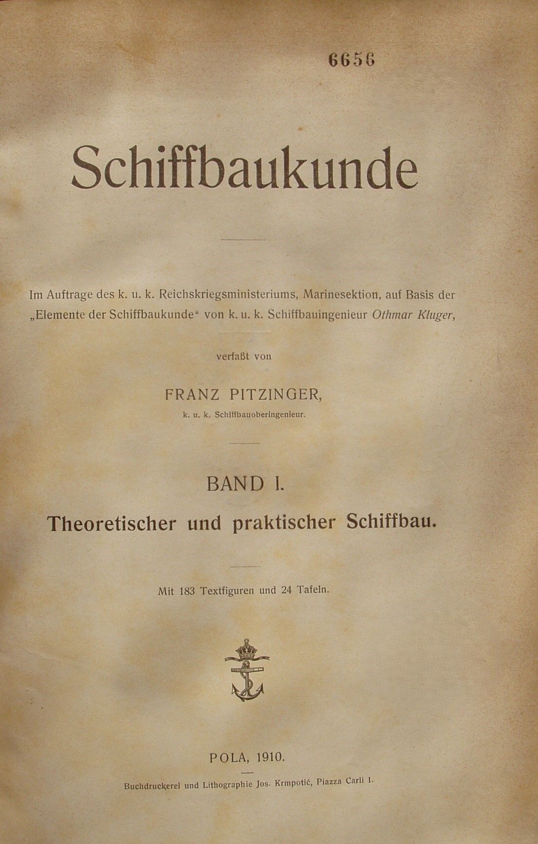 Najstariji udžbenik nosi naslov Leitfaden für den Unterricht an der Maschinenjungen- und Machinen-Unteroffiziers-Schule S. M. Kriegs-Marine (Upute za školsku obuku na Školi za strojarske dočasnike i Školi za učenike strojarstva c. kr. Ratne mornarice), u dva sveska (1876.-1877.; 2. izdanje objavljeno je 1885.).